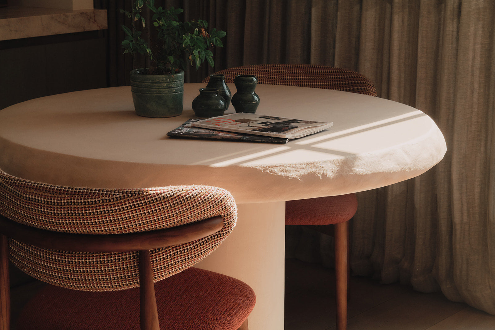 The Signature Collection offers a range of made-to-measure tables in Mortex and wood, featuring classic round or oval shapes, as well as more organic, sculptural designs. While this is our standard collection, every piece remains unique, with its own character and the distinct Arsène design signature.