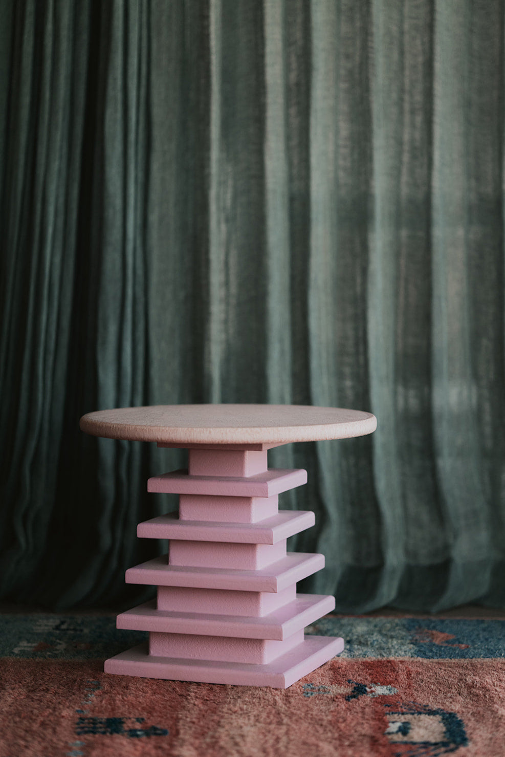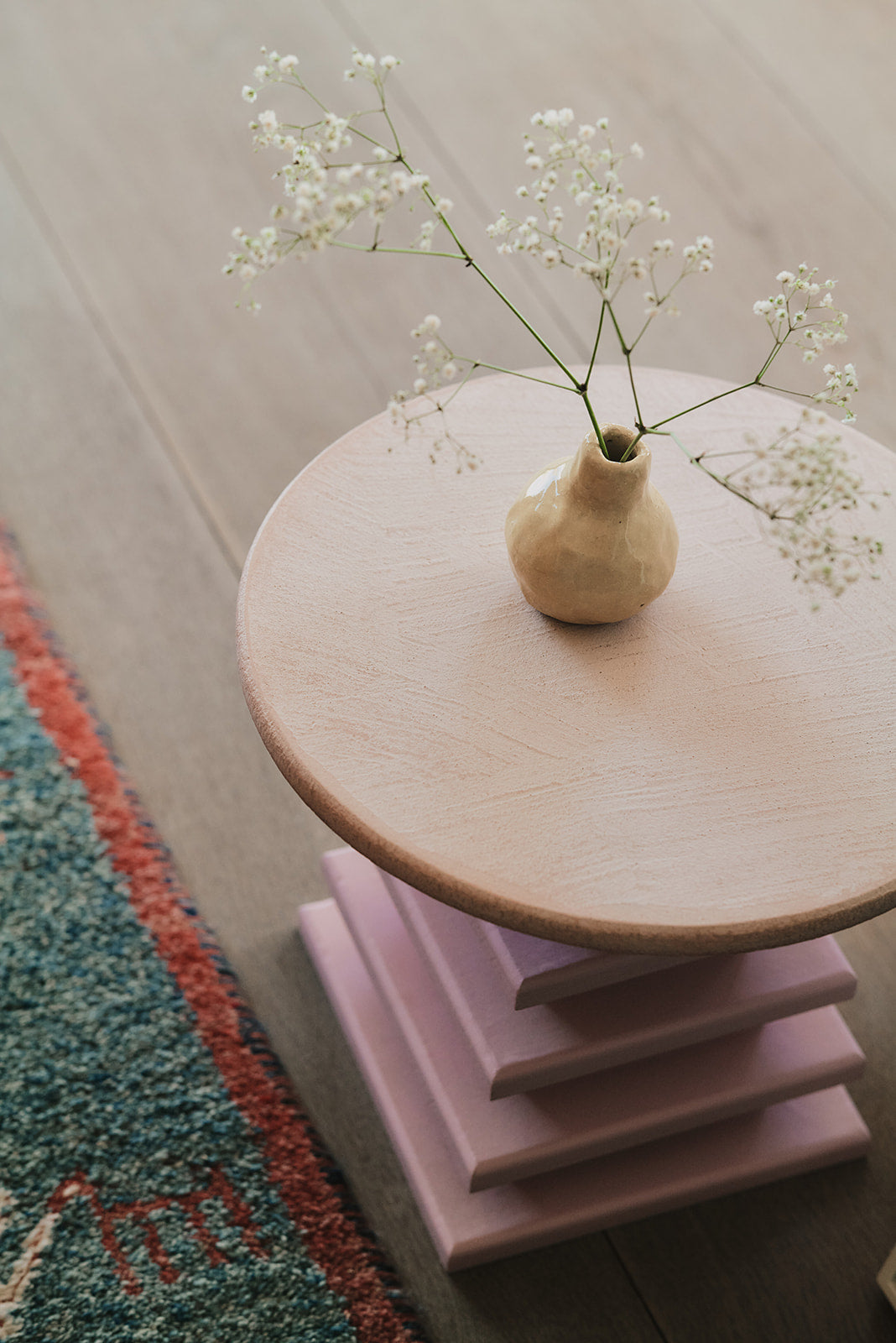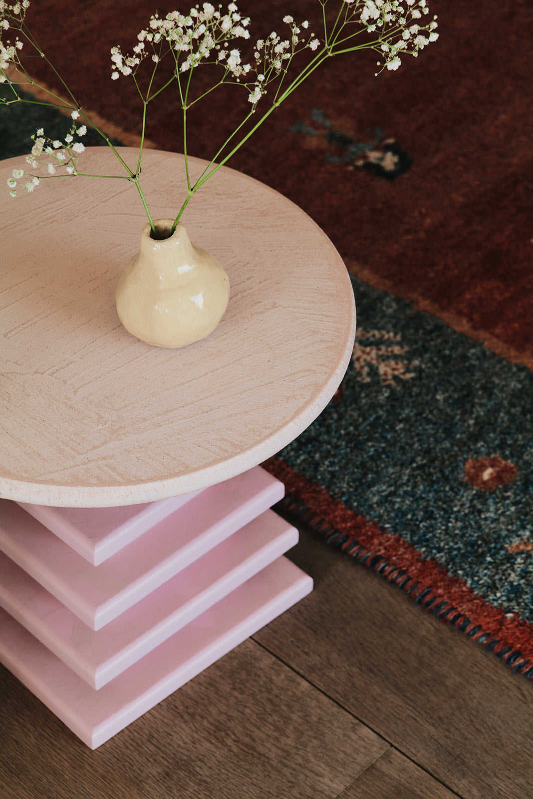 Véronique is een gedurfde, sculpturale bijzettafel, ontworpen door Anthony Defrancq voor Arsène. De vierkante voet en het afgeronde blad spelen met geometrische contrasten, terwijl de zachtroze Mortex-afwerking een speels maar verfijnd karakter geeft.