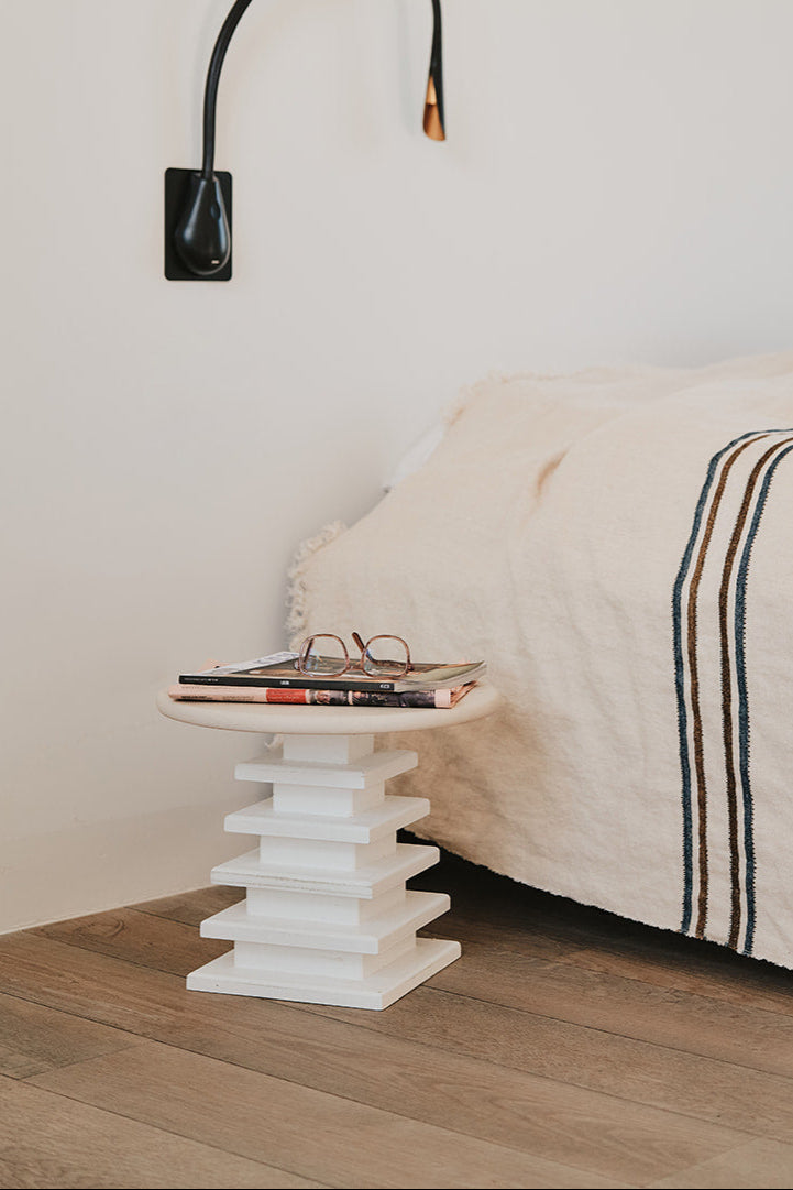 Een compacte en sculpturale bijzettafel met een speelse elegantie. Deze kleinere versie van het Véronique-model valt op door het contrast van de vormen: een vierkante basis met een zacht, afgerond oppervlak. De afwerking in strak wit Mortex brengt lichtheid en helderheid in elke ruimte.