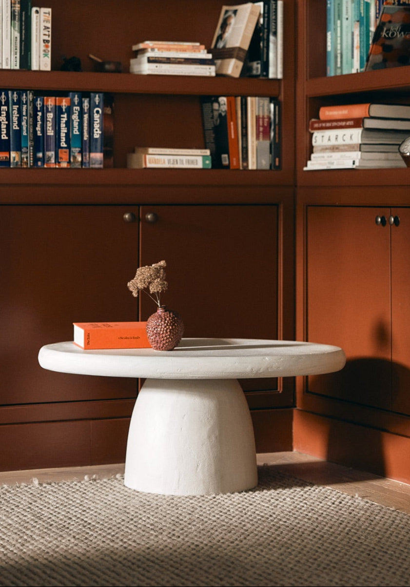 A refined and sculptural coffee table with a calm, architectural presence. Nicole stands out with its singular round leg and generous top, creating a balanced and unexpected composition. Fully finished in soft white ecru Mortex, it blends effortlessly into a serene interior while maintaining its unique character.