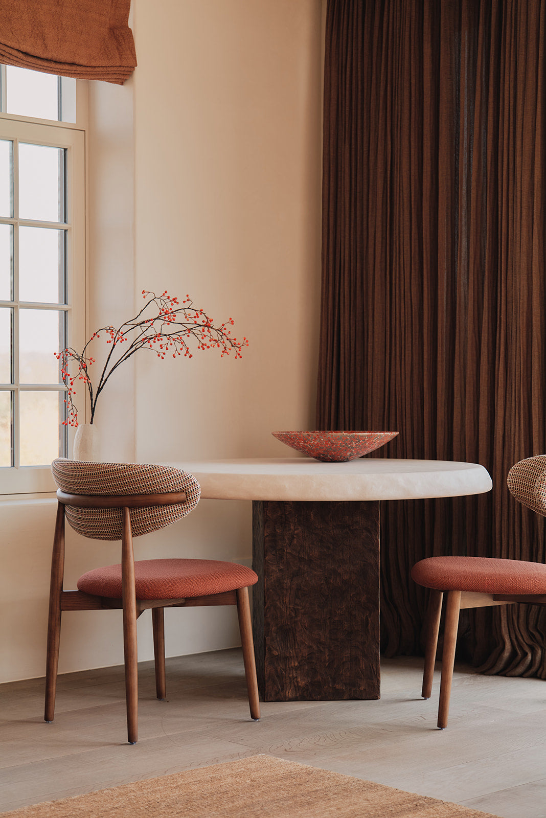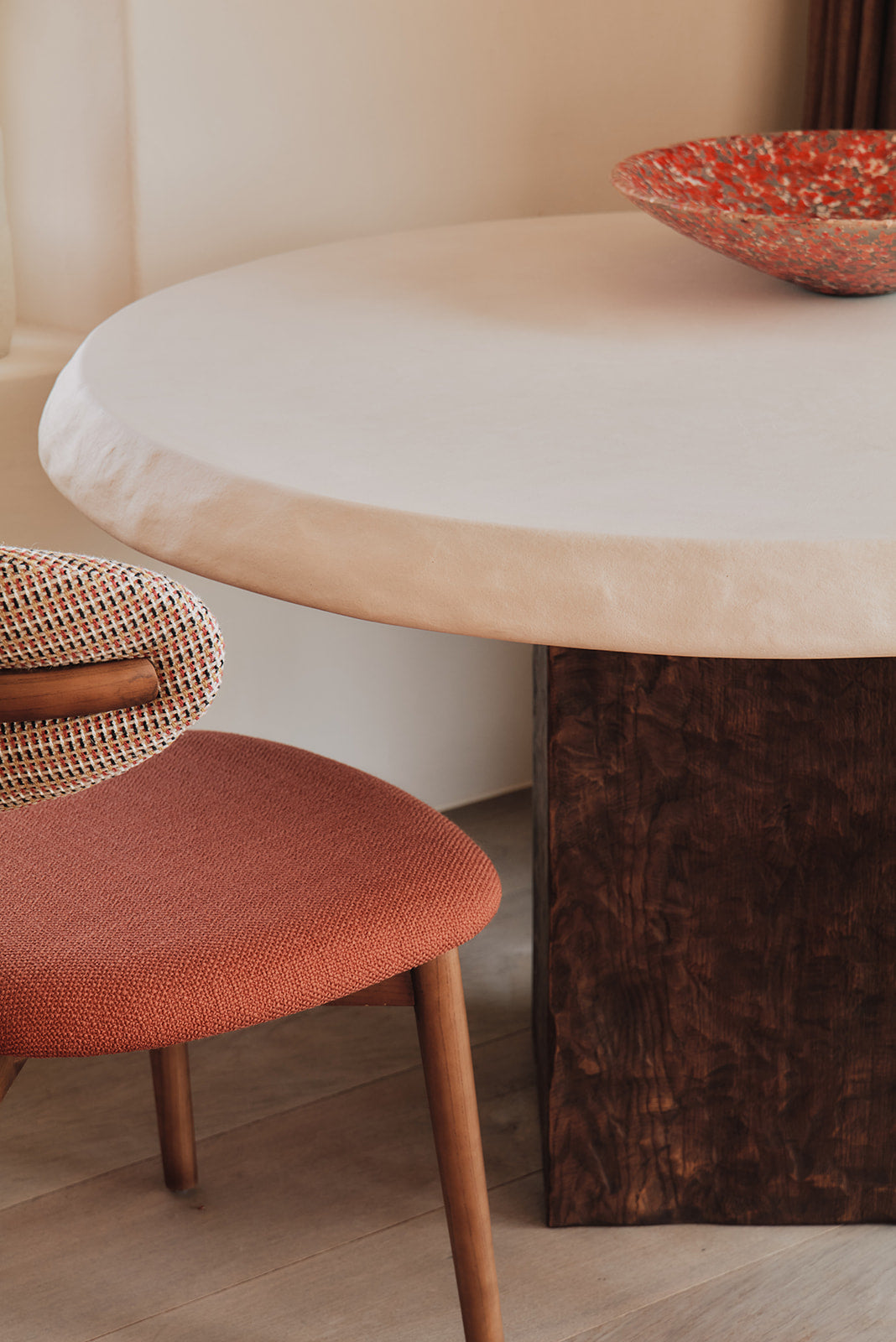 Meet Pierre, a round table with a raw, sculptural soul. Its tabletop features hand-shaped, textured edges that evoke the feel of natural stone, while the solid wood base, also carved by hand, anchors the piece with warmth and weight. The two elements come together in a striking harmony of material and form.